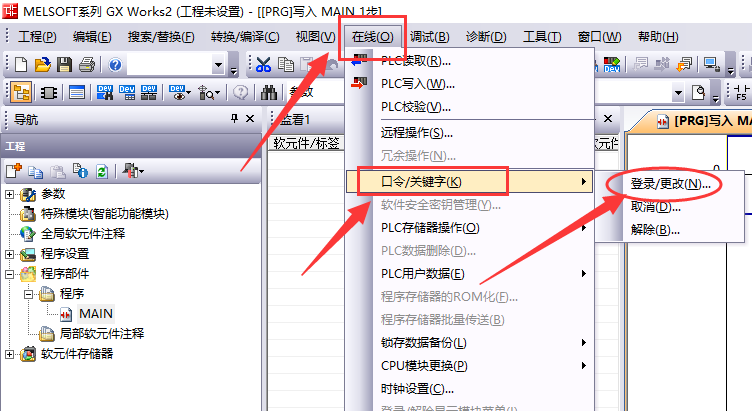 将PLC开关打到STOP状态,然后在“GX Works2”软件中,选择“在线”菜单=>“口令/关键字”=>“登录/更改”菜单项。在弹出的对话框中,选择“无法解密的保护”以及“读取/写入禁止”项,点击“执行”按钮即可完成加密。